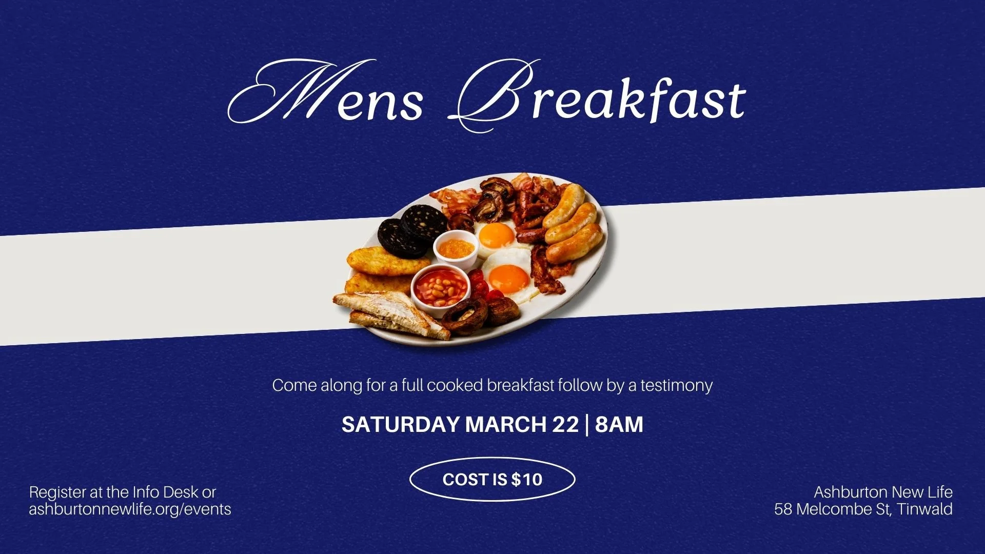 Hey guys! Coming up on Saturday March 22nd we are having a Men’s Breakfast - 8am at Church for a full cooked breakfast. Click below to register - cost is $10